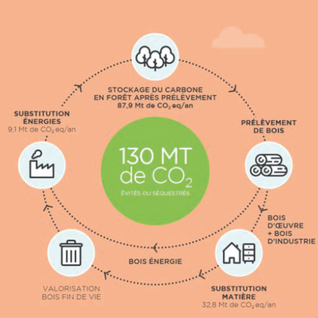 Au-delà de ce rôle de stockage, la filière forêt bois est un acteur stratégique de la décarbonation. L’utilisation du bois comme matériau ou énergie renouvelable permet de substituer les ressources fossiles (acier, ciment, charbon), réduisant ainsi les émissions de gaz à effet de serre d’origine fossile.
