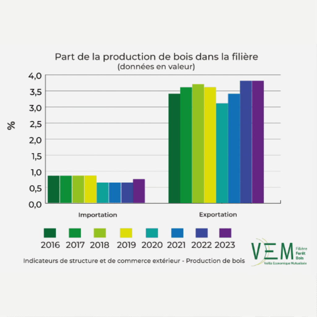 La Veille Economique Mutualisée de la Filière Bois est conçu comme un portail statistique qui permet aux professionnels et aux décideurs d’accéder à l’information de manière centralisée et cohérente, améliorant ainsi la connaissance et la communication entre tous les maillons de la chaîne du bois.